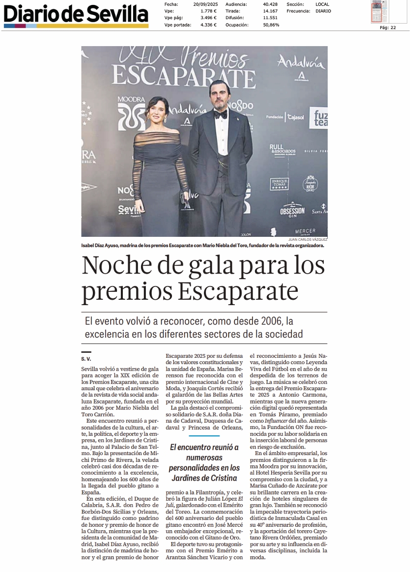Excelentísimo señor alcalde de Sevilla,Excelentísimo señor Consejero de Presidencia de la Junta de Andalucía,Altezas Reales, Padrinos de honor, Premiados, amigos de siempre y de Escaparate:Qué felicidad reencontrarnos esta noche en torno a Sevilla para celebrar 19 años de vida de nuestra revista, líder en el sector en Andalucía. A punto de lanzar la publicación 224. 19 ediciones de sus galardones. Y hacerlo, por primera vez, en estos Jardines del Cristina, con el Palacio de San Telmo de...