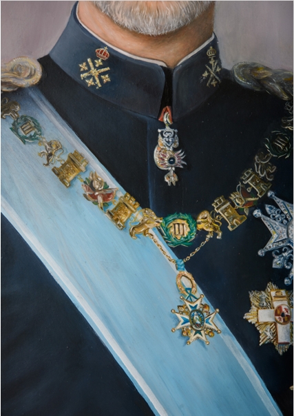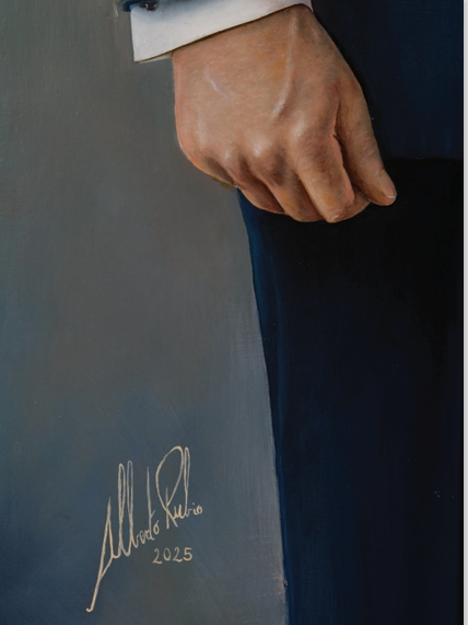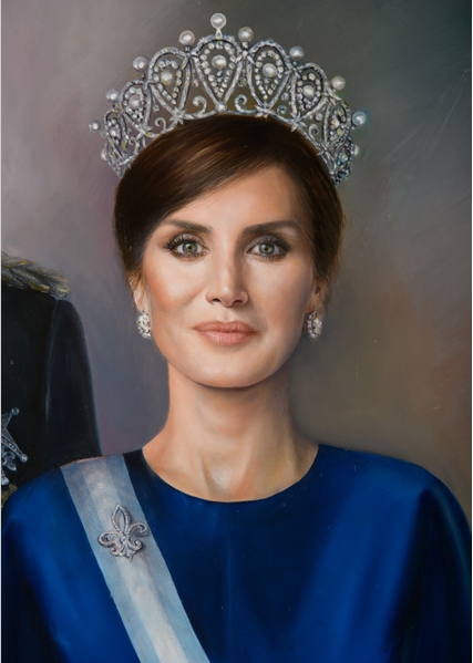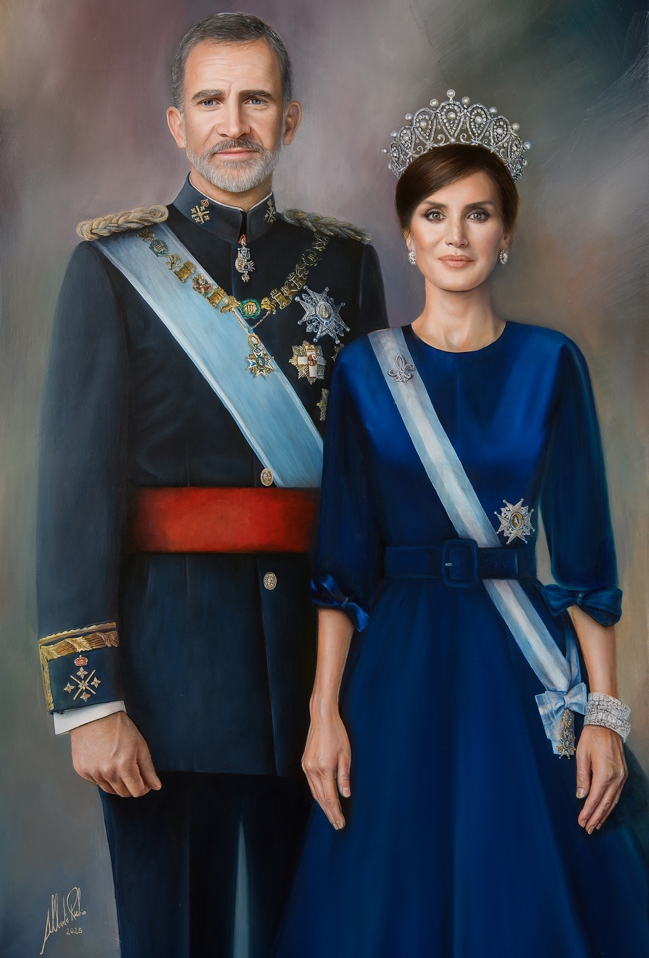 Desde el principio tuve claro que debía retratar a ambos, a Felipe VI y a la reina Letizia. Al Rey se le ha representado en numerosas ocasiones, pero me parecía fundamental incluir a la Reina, no solo por su papel institucional, sino también por la relevancia que ha tenido en el ámbito social y cultural, algo que yo mismo pude apreciar de primera mano trabajando en fundaciones vinculadas a las causas que ella apoya. Quería que el retrato reflejara esa dualidad y que quedara como testimonio de este momento histórico, mostrando a la pareja real en toda su dimensión y con la solemnidad de una obra de gala.