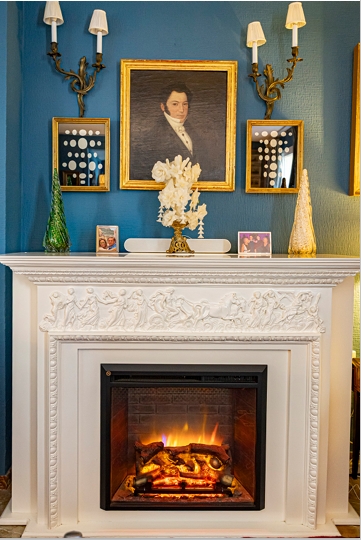 Las paredes, revestidas de un sobrio y profundo azul pavo, sirven como telón de fondo para realzar la nobleza del mobiliario oscuro, en su mayoría del siglo XIX, generando un contraste visual que potencia la elegancia del conjunto. Sobre este marco clásico destacan obras pictóricas de artistas consolidados como Salinas y Ricardo Suárez, cuyas composiciones aportan un sutil contrapunto contemporáneo, completado con piezas de los creadores The Exvotos, que introducen una sensibilidad artística actual sin romper la coherencia decorativa.