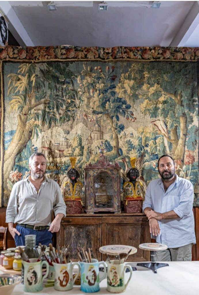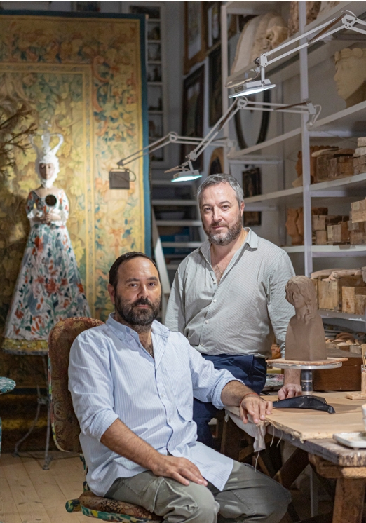 Y es que el cliente, al llegar a su estudio, no entra simplemente en un lugar de trabajo: es un santuario, un espacio vital e íntimo donde la creación y la vida se entrelazan. Viven donde trabajan, lo que les permite estar en un estado de inspiración constante. Lejos de ser una nave impersonal, su estudio es una escenografía cuidadosamente diseñada, donde cada detalle —desde la decoración y la iluminación hasta los utensilios, el mobiliario y la música— está pensado para estimular los sentidos y alimentar la creatividad. Es un espacio sincero con su forma de ver el arte, un entorno casi teatral que emana la estética y la filosofía que luego plasman en sus obras. Por eso, el día a día transcurre como en un convento de clausura, donde la dedicación es absoluta y las distracciones son pocas, pero la felicidad es plena.