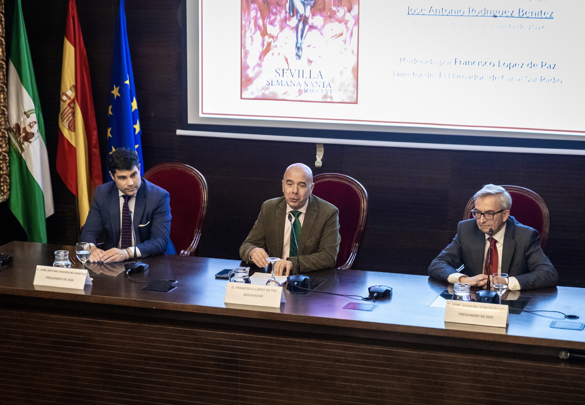 La Fundación Cámara de Sevilla celebró su ‘XXXVI Encuentro con la Semana Santa. El Pregón Antes y Después’, en el que participó el pregonero de la Semana Santa de Sevilla 2026, José Antonio Rodríguez, y el del año pasado, José Joaquín León.